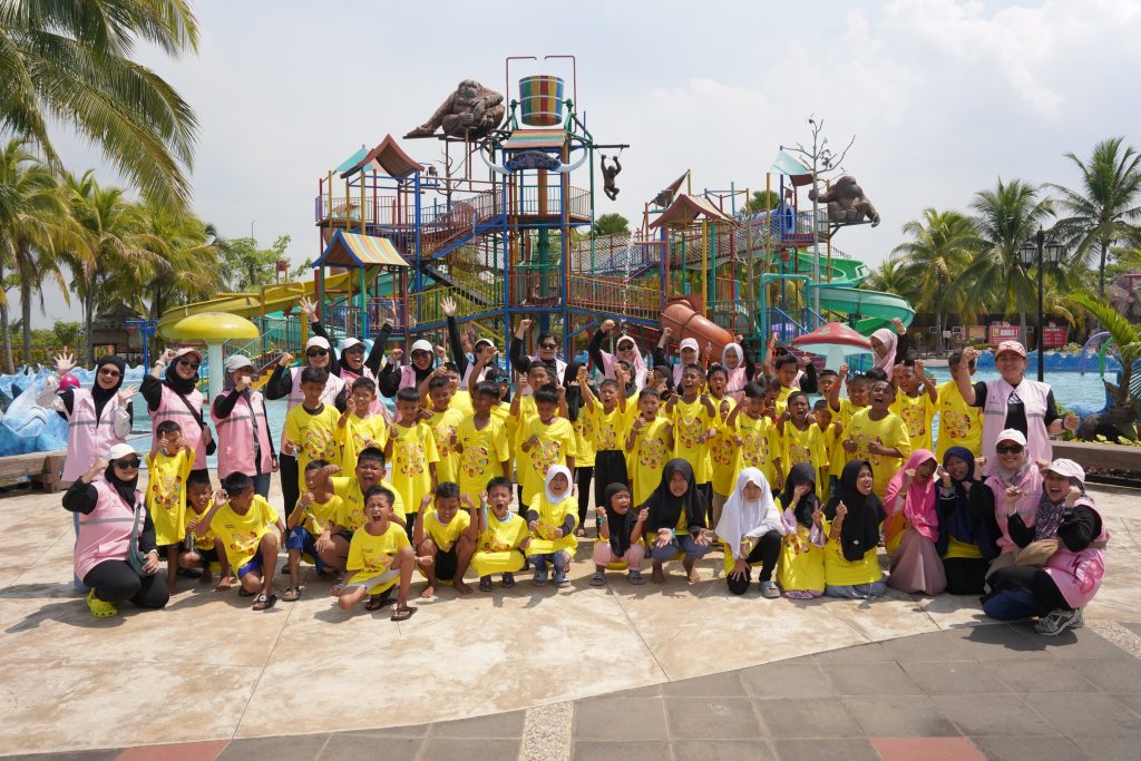 Srikandi PLN UID Kalimantan Barat berfoto bersama anak-anak peserta kegiatan yang tampak antusias dan penuh semangat, di Plaza Waterpark Qubu Resort, sebelum memulai sesi renang dalam rangkaian acara “Srikandi Movement: Sahabat Anak”.(FOTO/DOK/PLN)