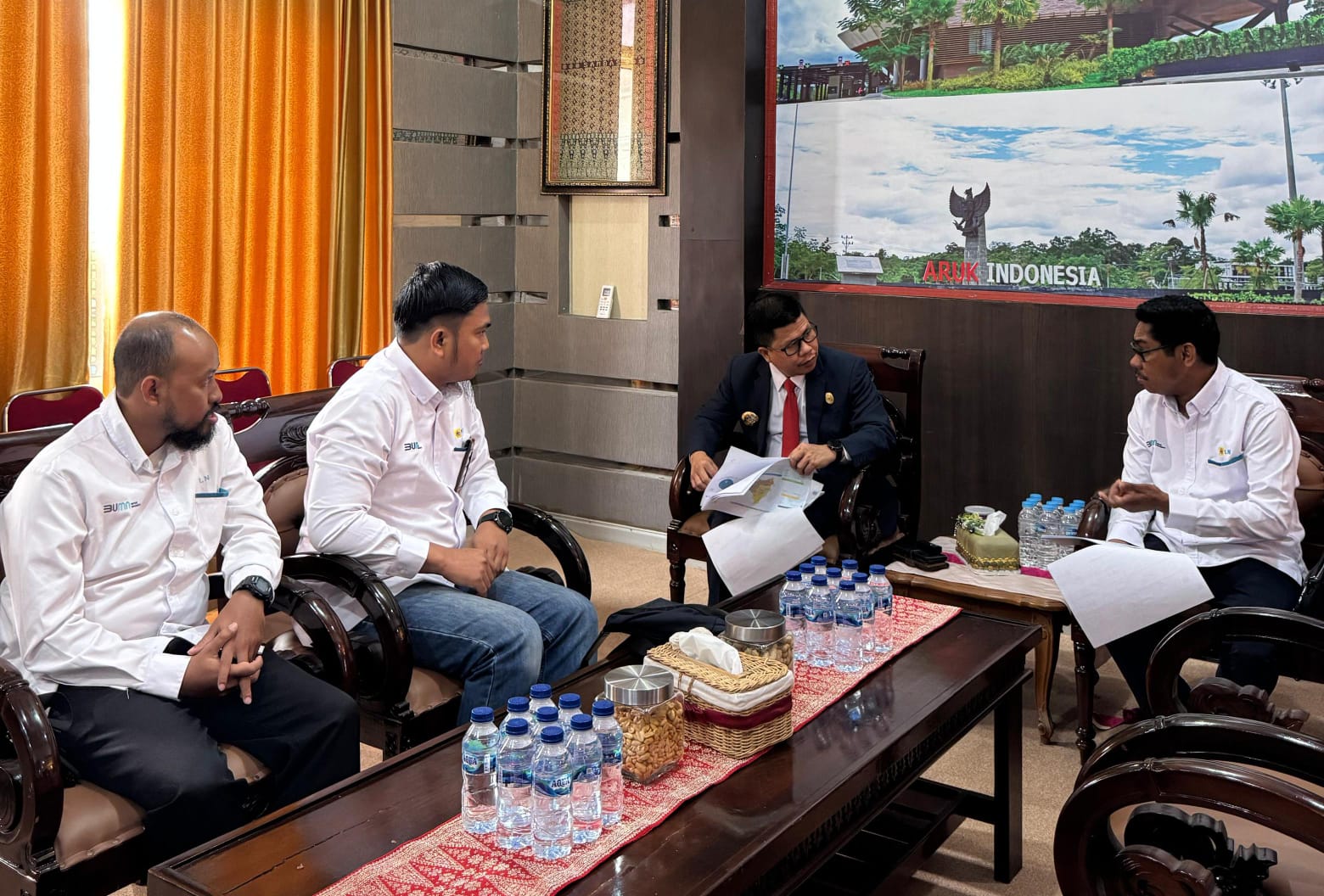 Diskusi penuh semangat antara Bupati Kabupaten Sambas, H. Satono, S.Sos.I., M.H, (kedua dari kanan) dan Manager PLN UP3 Singkawang, Martinus Irianto Pasensi (pertama kanan). Kunjungan ini membuka jalan bagi terwujudnya listrik andal demi ketahanan pangan, pendidikan, dan kesejahteraan masyarakat kabupaten sambas.(FOTO/DOK/PLN)